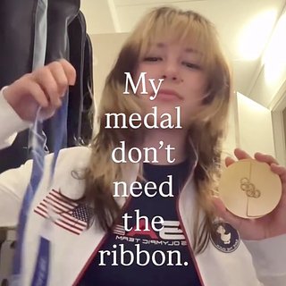 Спортсменка рассказала, что от её золотой олимпийской медали оторвалась лента. «Моей медали лента не нужна», — пошутила она.